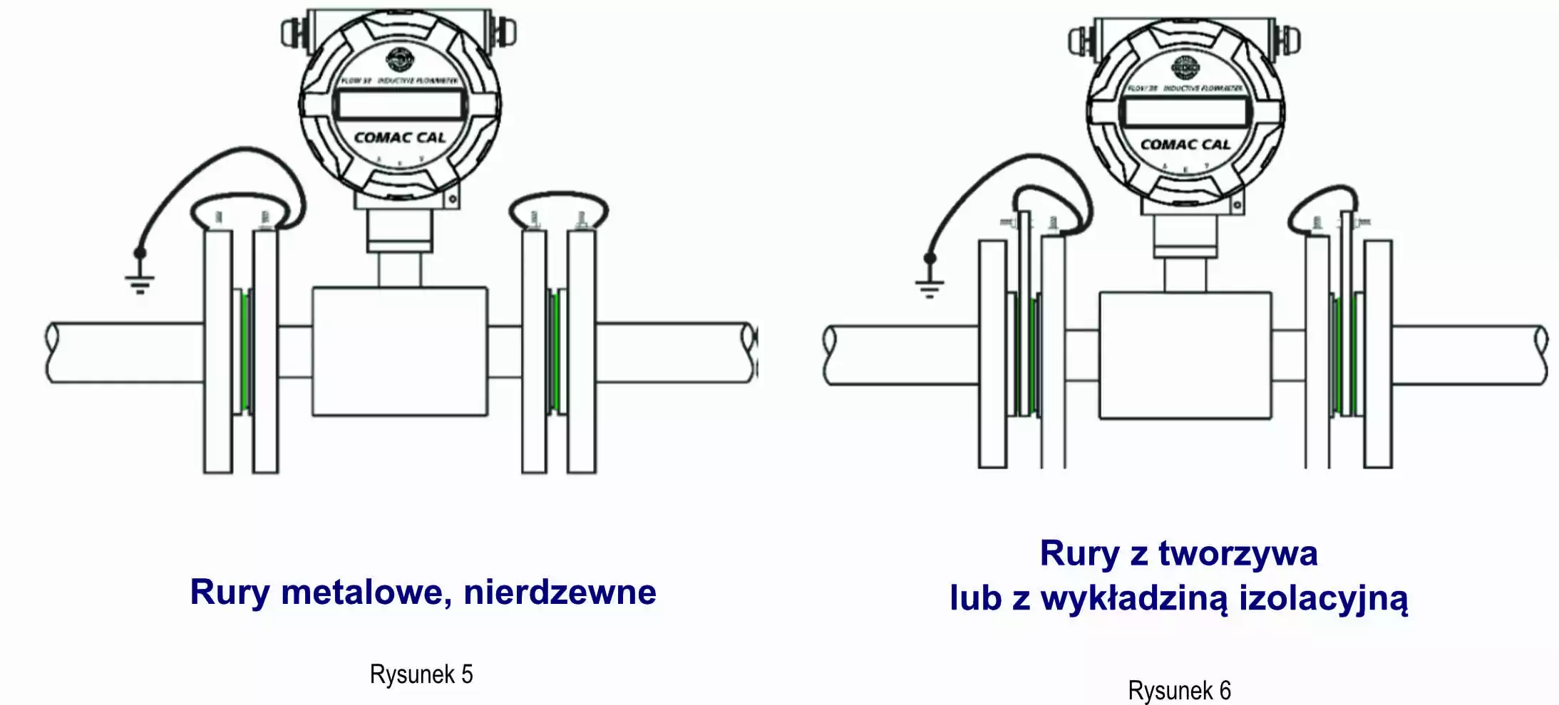 Ostatnim bardzo ważnym elementem montażu przepływomierza elektromagnetycznego jest jego prawidłowe uziemienie. W celu wyrównania potencjału elektrycznego kołnierze przepływomierza powinny być połączone uziemieniem z kołnierzami rurociągu i uziemione (Rysunek 5). Nieco inaczej wygląda to w przypadku stosowania przepływomierzy na rurach wykonanych z tworzywa lub posiadających wykładzinę izolacyjne, np. po renowacji rurociągu poprzez natrysk z tworzywa sztucznego. Wtedy konieczne jest stosowanie pierścieni uziemiających montowanych pomiędzy kołnierzami (Rysunek 6).