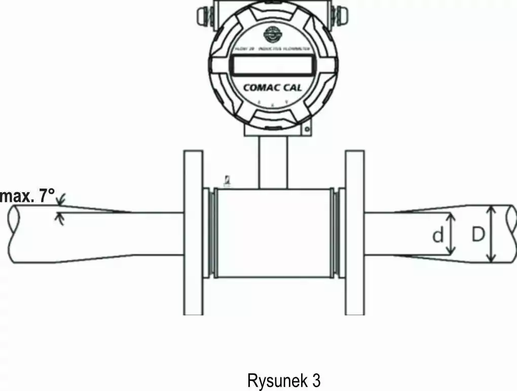 Returning to the issue of ensuring proper fluid flow through the pipeline, i.e., ensuring adequate filling and minimum flow velocity, it is best to use a flowmeter in applications with forced (pump) flow. Here, too, it's worth selecting the nominal flow rate within 20%-80% of the measurement range, leaving some margin for non-standard, periodic flows outside this range. To this end, it's good practice to tape the pipeline so that the flow is faster and flows through the full pipe. When tapering the pipeline, remember that the taper angle should not exceed 7° (Figure 3).