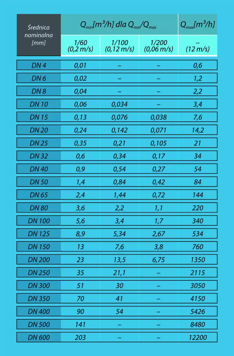 Regardless of the medium being measured and its conductivity, an appropriate flow velocity is necessary to generate a voltage at the measuring electrodes. To achieve adequate measurement quality, i.e., with a maximum measurement error of 0.5%, a flow rate of 0.2 m/s is recommended. This represents 1/60th of the maximum flow rate we can measure, i.e., 12 m/s. The table below shows how this translates to m³/h. In certain diameters, it is possible to increase the flowmeter's sensitivity for minimum flow rates to 1/100th or even 1/200th of the maximum rate, i.e., 0.12 m/s or even 0.06 m/s. It should be noted that flow values in m³/h refer to a uniform flow over a full hour. For example, if we have a flow of 5 m³/h, but it only flows for 10 minutes of the hour, we actually have an average flow of 30 m³/h, and the flowmeter's measurement range should be selected accordingly.